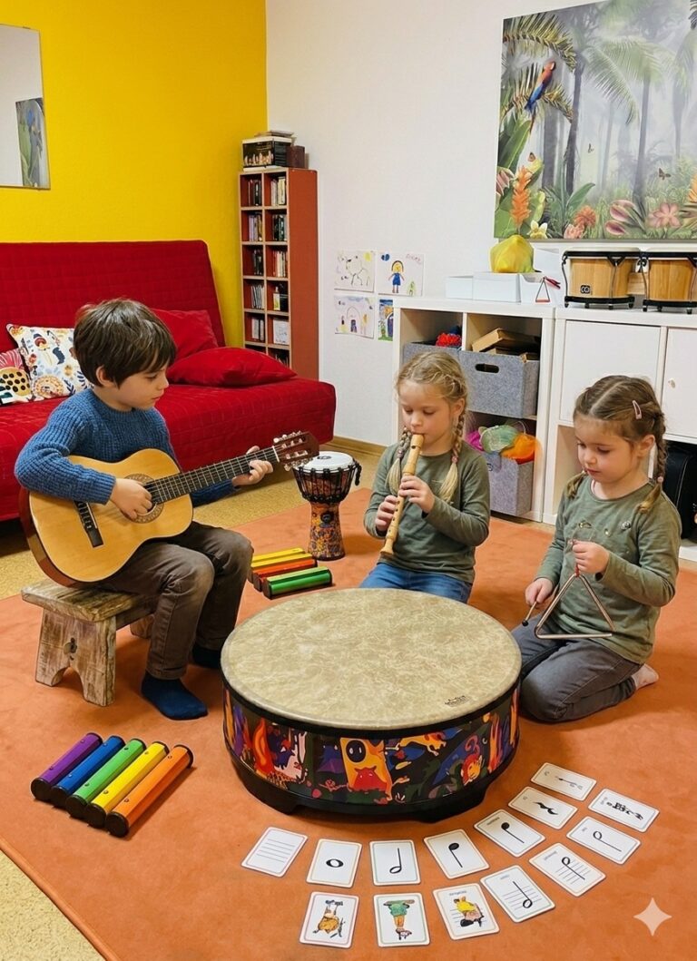 Kinder lernen Musik nicht, indem sie still sitzen und nachspielen. Sie lernen, indem sie ausprobieren, sich bewegen und gemeinsam musizieren. Dieser Kurs ist ein ganz besonderer Schritt. Hier verbinden sich musikalische Grundlagen mit dem ersten Kennenlernen von Instrumenten: